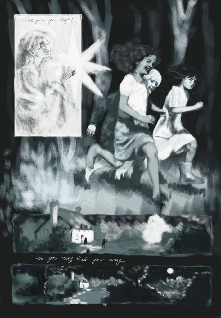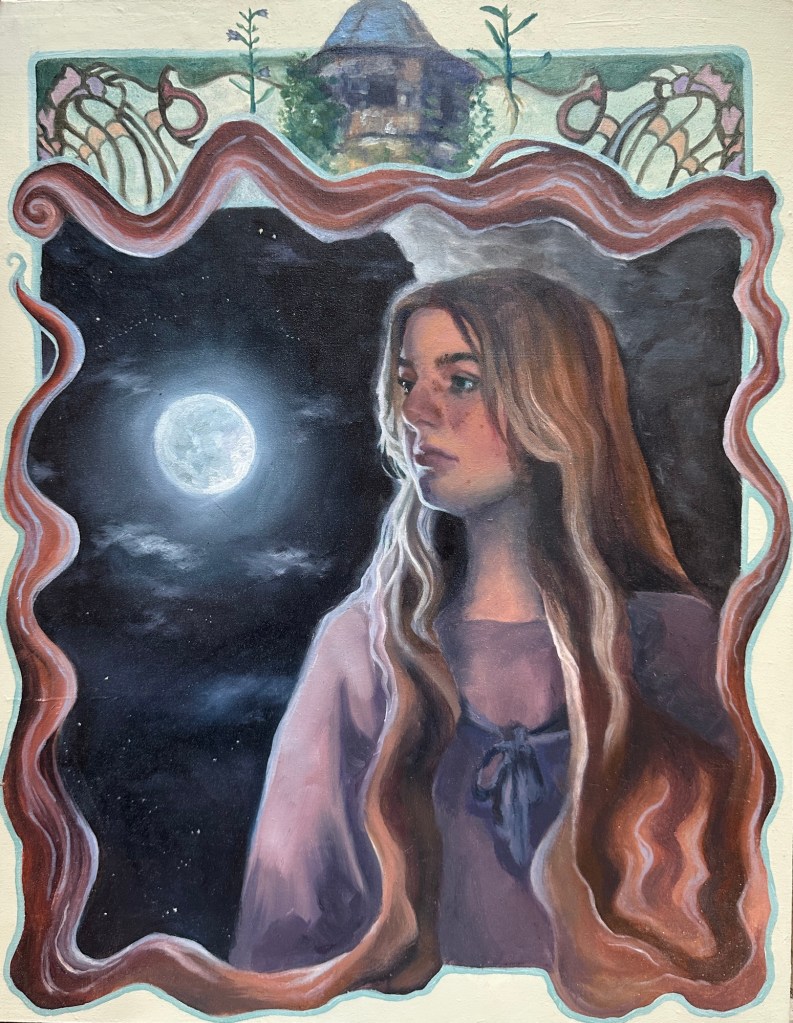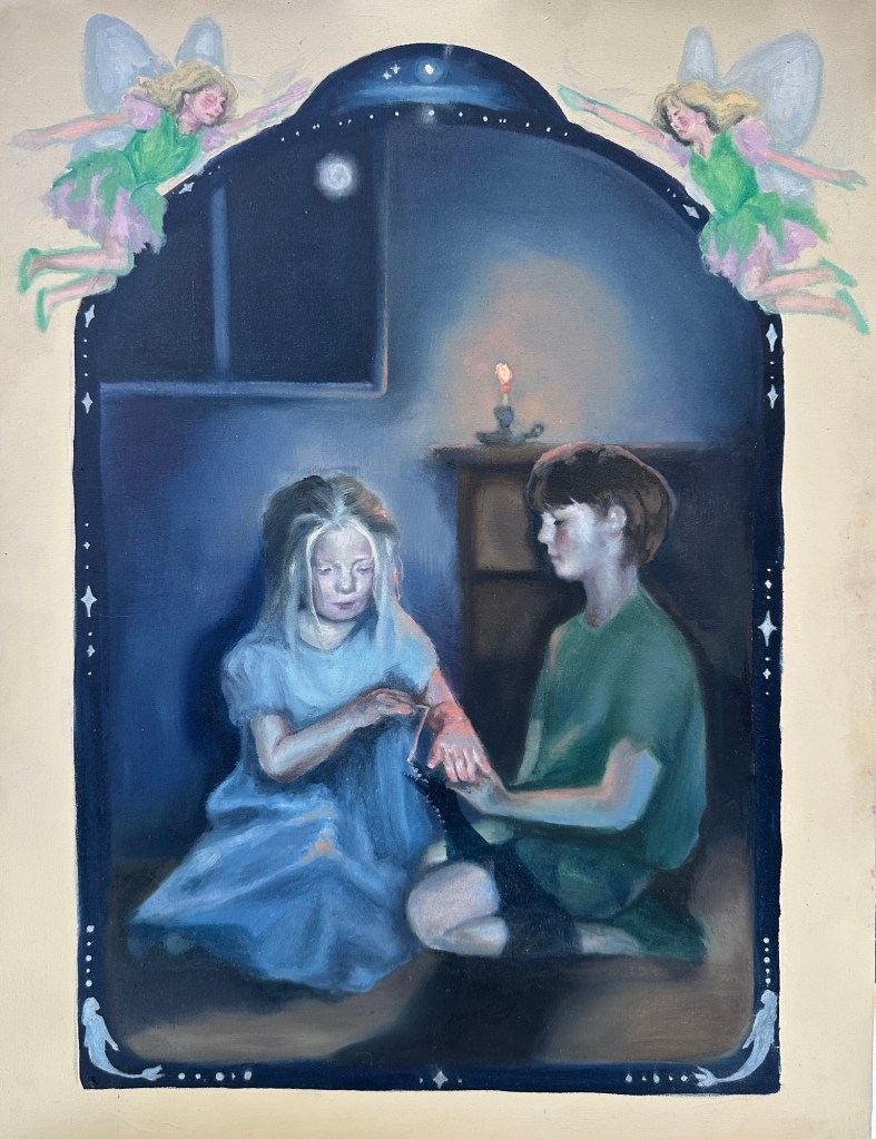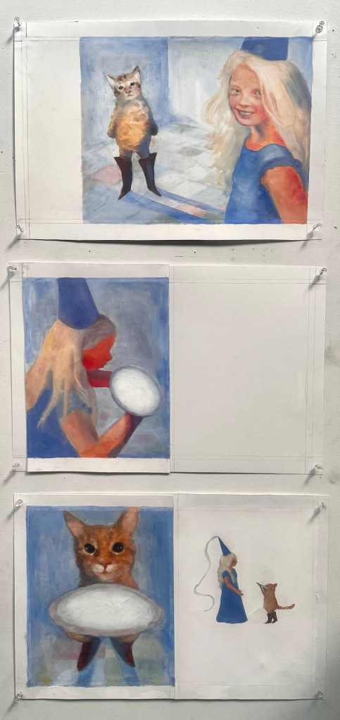 “little bears” 2025, 11″x20″, watercolor and colored pencil on bristol“puff in boots” 2025, 16”x10”, oil paint on bristol “peter and wendy”, 2023, 16”x20”, oil on canvas panel“fairest of them all”, 2022, 16”x20”, oil on canvas panel “little red”, 2023, 16”x20”, oil on canvas panel“rapunzel”, 2023, 16”x20”, oil on canvas panel“the little mermaid”, 2022, 16” x 20”, oil on canvas panel“the pea”, 2023, 16”x20”, oil on canvas panel“the beast”, 2023, 16”x20”, oil on canvas panel“Interview With the Vampire” jacket, 2024 procreate “is my very nature that of the devil” 2024, procreatesequential story excerpt, 2025, procreate